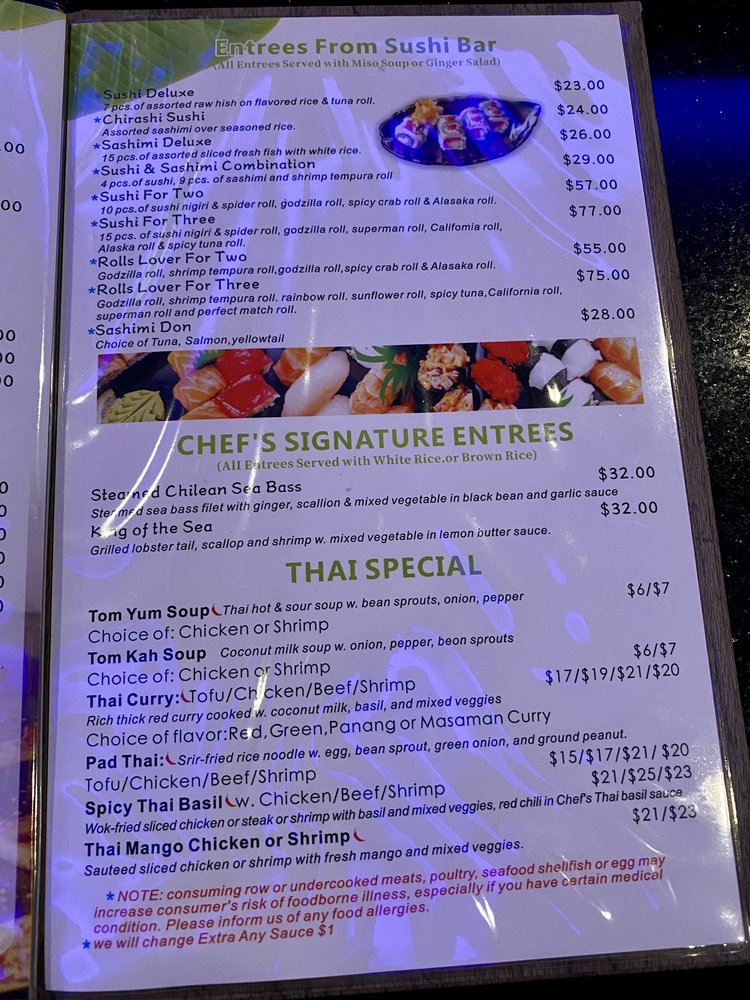 Godzilla roll, shrimp tempura roll, rainbow roll, sunflower roll, spicy tuna, California roll, superman roll, and perfect match roll.